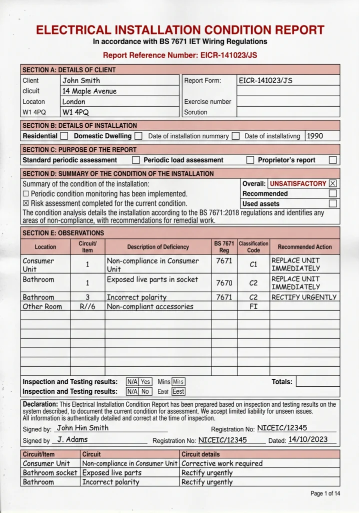 Last reviewed: 27 April 2026. This page is maintained regularly. We correct errors and refresh sources as electrical safety regulations and guidance change. EICR legal requirements updated following Social Housing (Regulation) Act 2023 implementation. BS 7671 references current as of 18th Edition Amendment 2 (2022). Costs and market expectations reviewed quarterly based on industry data. Next review scheduled: April 2026 following any regulatory changes.