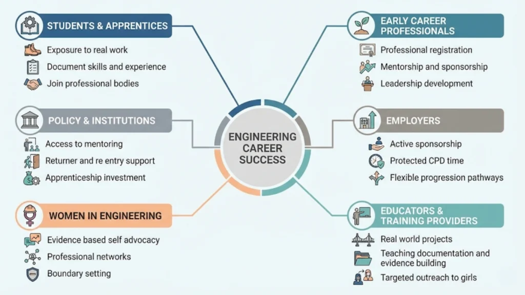 The goal is not to suggest “just work hard and you will win awards.” It is to identify specific, evidence-based career development behaviours that accelerate progression for women, for men, and for anyone navigating early-career engineering in the UK, while acknowledging the structural barriers that make progression unnecessarily difficult for underrepresented groups.