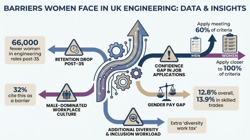 The context these patterns exist within, however, reveals significant challenges. Women comprise only 16.9% of the UK’s 6.4 million engineering workforce, compared to 56% representation in other occupations. Girls’ interest in tech careers sits at 23% versus 52% for boys. Retention drops sharply post-age 35, with 66,000 fewer women in that demographic. The gender pay gap in skilled trades reaches 13.9%, and barriers like male-dominated culture affect 32% of women in engineering according to IET research.