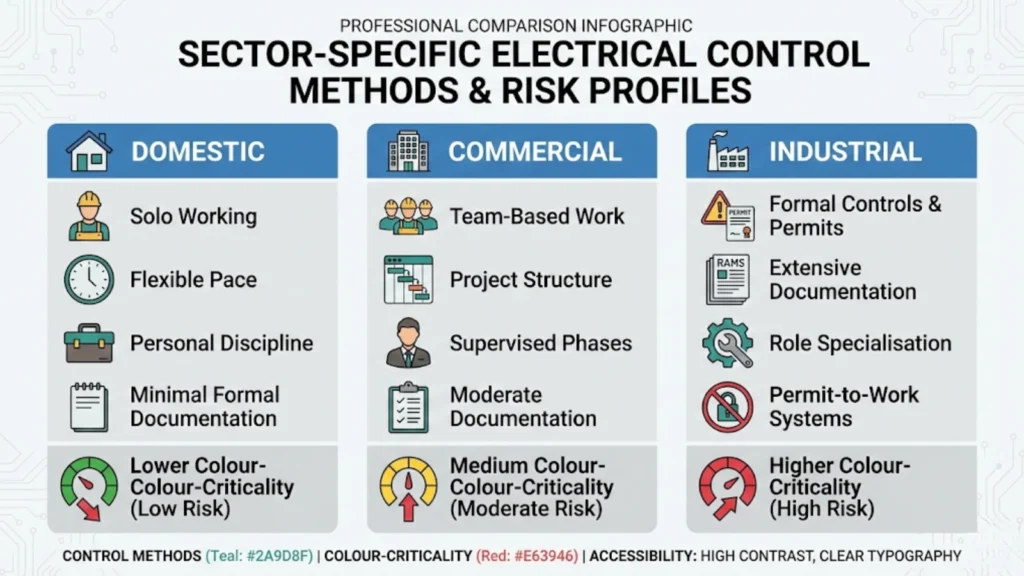 The sector you work in, the roles you take on, the verification methods you develop, these determine success more than diagnosis. Domestic work offers flexibility but requires self-discipline. Commercial work provides project structure and team support. Industrial work has formal controls that mandate verification. Within each sector, specialization allows matching strengths to requirements, installation and planned maintenance suit systematic verification better than emergency fault-finding, testing and commissioning provide time for thorough checking, design and documentation eliminate colour requirements entirely.