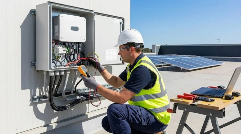 Testing and commissioning: Insulation resistance testing at appropriate DC voltage levels, polarity verification confirming correct series connections, open-circuit voltage measurement per string, short-circuit current measurement, earth continuity testing for array frames and mounting structures, inverter commissioning including grid parameter settings, functional performance verification.